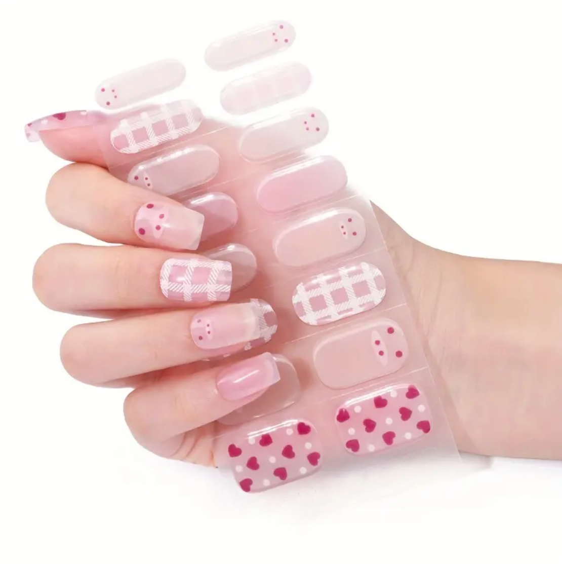 Nail polish stickers aka (gel) nail wraps are often confused with semi-cured UV gel nail strips due to their similar appearance; open box with similar layout of gel-like wraps on a clear sheet. Nail wraps are thin adhesive stickers made out of polish or plastic compounds that you can apply directly to your nails, available in a variety of colors and patterns. Unlike traditional polish, nail wraps come pre-painted and are easy to apply without the use of a UV lamp. If you enjoy changing your nail style quickly, nail wraps are an ideal choice, allowing you to achieve a fresh manicure in just minutes. However, nail wraps do not last like the real UV gel nail strips which last for over 2 weeks if cared for. Nail polish stickers (or gel nail wraps) are a fun option for a quick manicure that lasts a day or two but lacks the durability and flexibility of UV gel nail strips.